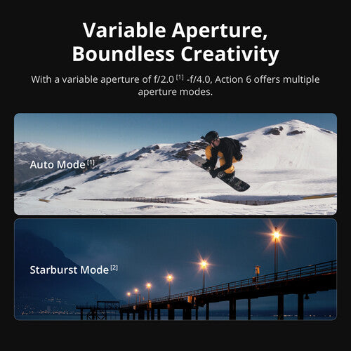 Capture steady, pristine video footage in up to 4K120 resolution wherever you are with the Osmo Action 6 Standard Combo from DJI. The Osmo Action 6 features a new 1/1.1" square sensor, Starburst mode, a variable f/2 to f/4 aperture, and it now has 50GB of internal storage, and it is more cold resistant. It maintains its high-bright dual OLED screens, RockSteady and HorizonSteady stabilization systems, a 38MP sensor, a 4-hour battery life, and a waterproof camera body with a water pressure gauge. Other features include 8K stills, subject centering/tracking, OsmoAudio support, raw footage capture, a 155° field of view, and an SD card slot that supports up to 1TB cards.